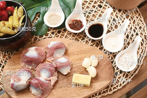 姜1块,蒜3瓣,豆瓣酱半勺,生抽1勺,淀粉1勺,胡椒粉2克,泡椒鸡胗的做法 泡椒鸡胗怎么做白糖半勺;