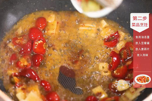2.锅中放入适量油,油温烧至6成热,放入豆瓣酱、姜蒜片、泡椒炒香;