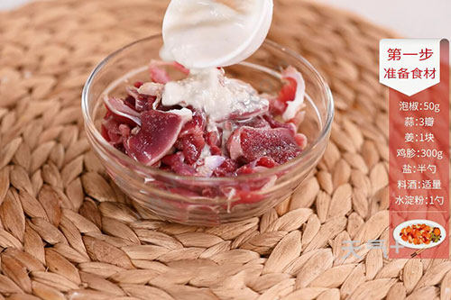 1.泡椒切碎,蒜切片,姜切片。鸡胗切片,放入盐半勺、料酒适量、水淀粉1勺拌匀腌制10分钟;