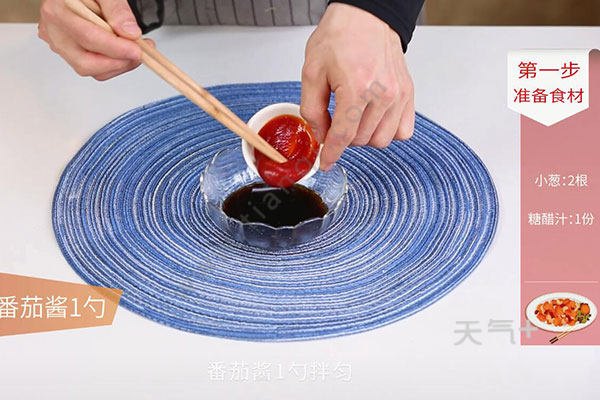 1.小葱洗净切葱花,醋2勺,生抽1勺,白糖10克,番茄酱1勺,清水2勺拌匀;