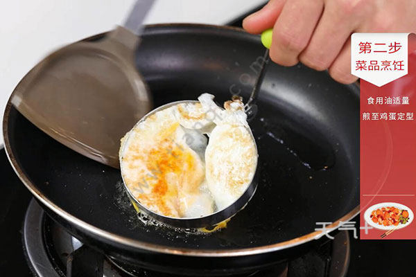 2.锅内放入少量油,磕入鸡蛋中火煎至定型,盛出待用;
