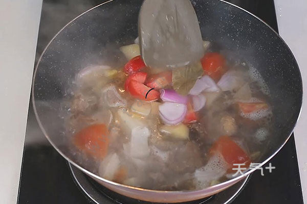 2.油温烧至6成热,放入一半的洋葱和蒜粒炒1分钟,再加入番茄 牛腩翻炒半分钟;