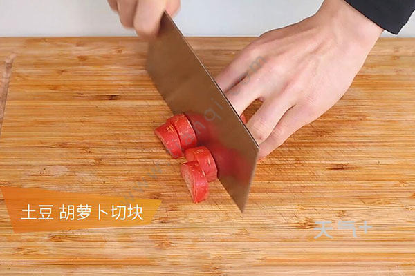 1.先把蒜切粒,土豆和胡萝卜切块,还有番茄和洋葱也要切块;