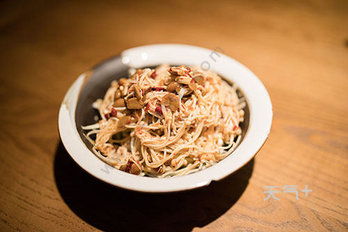 2、可以在金针菇里面加一些配菜,比如胡萝卜丝。