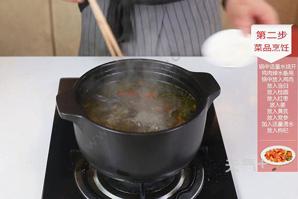 3.锅中放入鸡肉、当归、党参、黄芪、沙参、桂圆、红枣、清水适量大火烧开,换小火炖煮2小时,放入枸杞焖2小时,放入盐半勺拌匀即可享用。