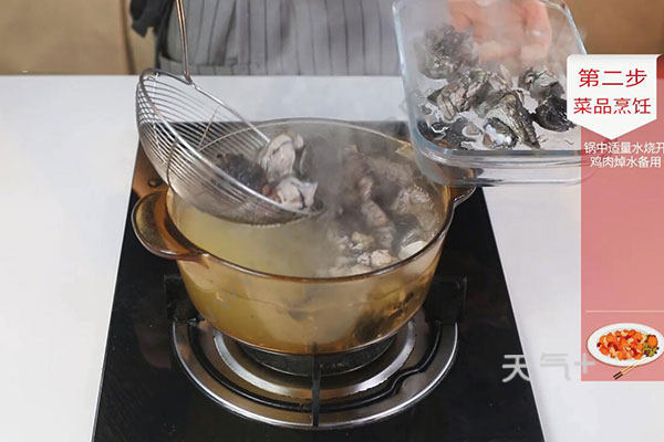 2.锅中放入适量清水烧开,放入鸡肉煮开,撇去浮沫,捞出待用;