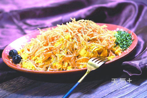 马介休炒薯丝是一道创意菜肴,也很受欢迎,马介休是葡国菜中很常见的一种材料,很多葡国菜都是用马介休制作而成。这道菜的主料是马介休、马铃薯,加入了红椒丝和其他的配菜,马铃薯切丝,和马介休等食材一起炒,成菜不仅色泽好看,吃起来也很可口。