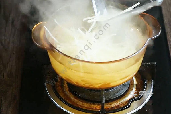 2.土豆丝放入沸水中焯水20秒,捞出沥干。