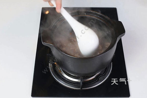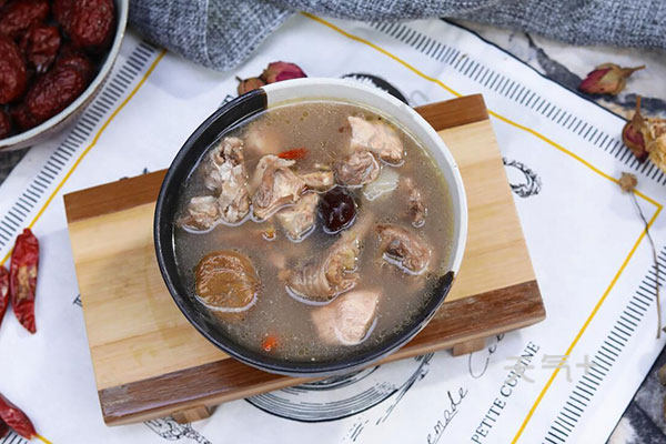 4.汤沸后改中火,炖30分钟,再放入红枣炖20分钟,汤汁收浓,放入盐和枸杞搅拌均匀,盛出即可。