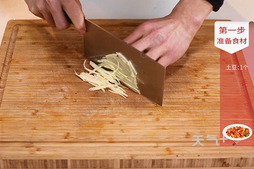 1.土豆去皮切细丝,放入清水中浸泡洗去淀粉;