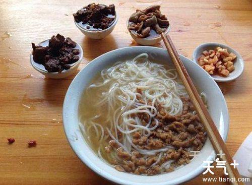 鹰潭牛肉粉独具特色,以油色鲜亮、汤汁咸辣、香味浓郁著称。米粉用水发好后放入盛满热汤的煮锅加热,捞起盛入大瓷碗,加入少许盐麻椒花椒等食材,最后浇上特制的红油和排骨熬制的鲜汤再舀一勺牛肉入碗即可。
