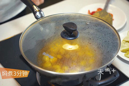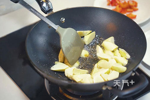 4.加入茭白、红椒继续焖2分钟。大火收汁后即可出锅。