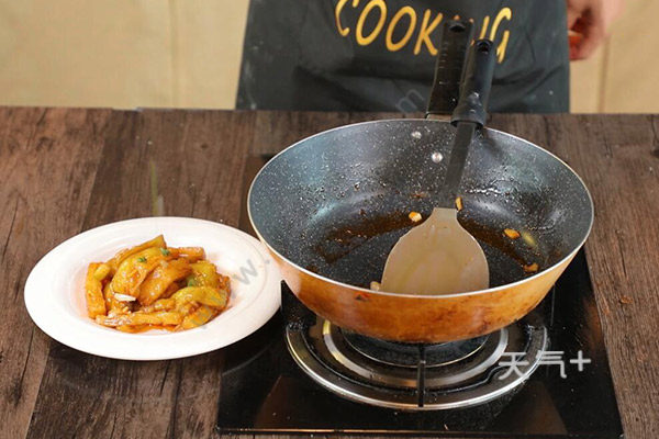 3.放入茄子炸至断生,捞出待用。换锅放入少量油,加入蒜末和番茄酱,炒香后倒入调料汁和茄子,即可盛入盘子中,最后撒上一些葱花就可以了。