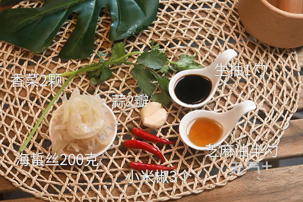 海蜇丝200克,小米椒3个,香菜2颗;