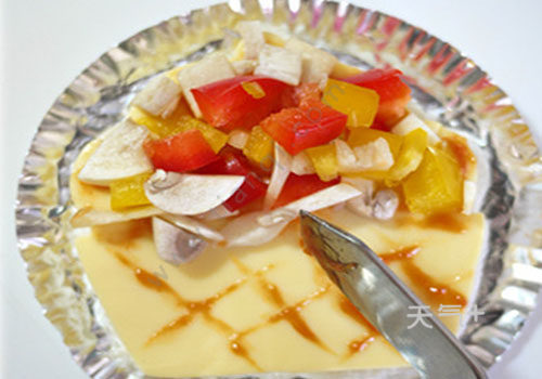吐司1片,起士1片,黄红彩椒少量,蘑菇,1朵,黑白菇菇少量,小蕃茄2颗,苹果1片,红萝卜1片;