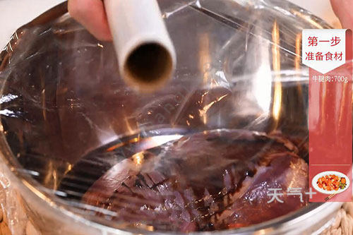 1.牛腱肉放入清水中浸泡3小时,期间换水3次。洗净后沥干水分,倒入生抽、老抽。盖上保鲜膜,放入冰箱浸泡隔夜;