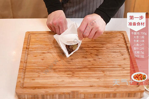 2.姜1块切片,大葱切段,将桂皮1块、香叶2片、八角2个、小茴香5克、白芷2克、花椒5克、草果1个、陈皮1块放入纱布包中封好;