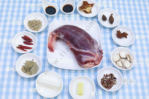 姜1块,大葱1段,桂皮1块,香叶2片,八角2个,小茴香5克,白芷2克,花椒5克,草果1个,陈皮1块,干辣椒6克,生抽200克,老抽20克,甜面酱60克;