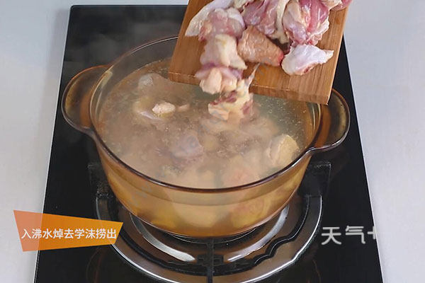 2.然后将鸡腿肉剁成小块,放至在沸水中焯去血沫捞出。