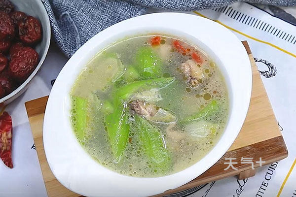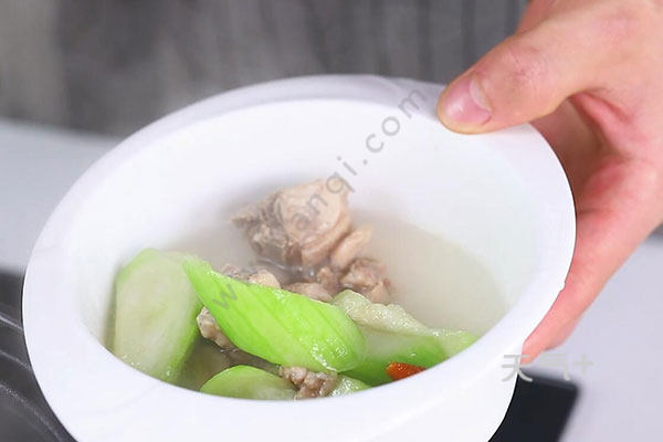 3.将鸡肉、葱姜块一起放进砂锅中炖40分钟,放入丝瓜炖30分钟,最后放入盐和枸杞即可。