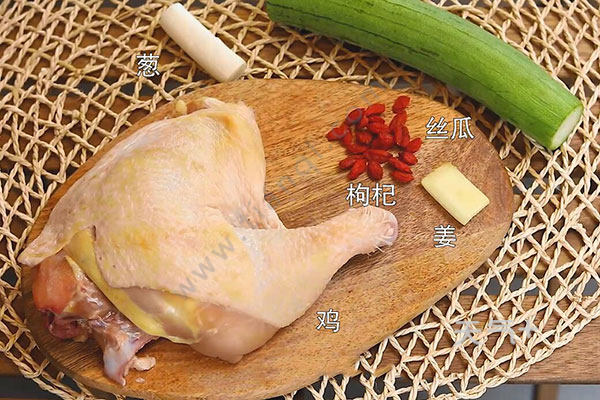 鸡腿肉1块,丝瓜1根,大葱1段,姜1块,枸杞少许;