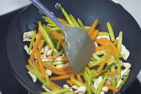 3.再在锅中放入鸡柳炒至变色,加入姜蒜末炒香,放入胡萝卜、芦笋翻炒均匀,调入盐、鸡精,水淀粉,炒匀后放入几滴香油即可。