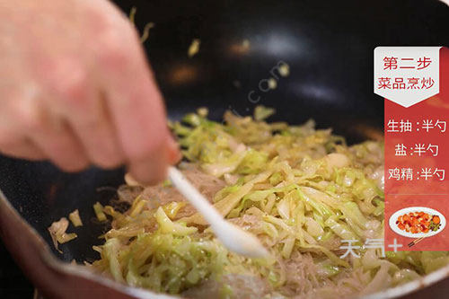 3.锅中放入适量油,油温烧至6成热,放入蒜末炒香,放入圆白菜翻炒半分钟,加入粉丝翻炒,调入生抽半勺、盐半勺、鸡精半勺翻炒均匀即可。