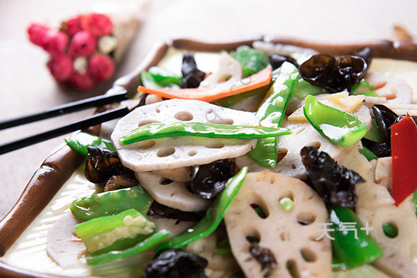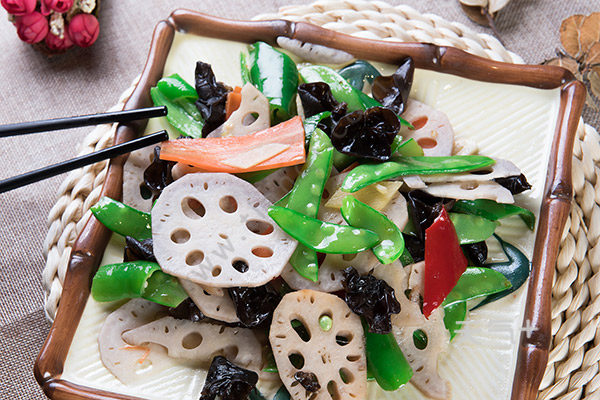 黑木耳泡发,胡萝卜洗净切片,荷兰豆掐掉头尾,莲藕切成片,放入清水里,锅中加清水烧开,加盐和几滴油,倒莲藕、荷兰豆和木耳焯烫1分钟,捞出,炒锅里倒油,下胡萝卜片翻炒,倒黑木耳和荷兰豆一起炒,最后,将藕片放进去,加盐炒匀,出锅前,再加糖提鲜,水淀粉勾芡一下,盛出。