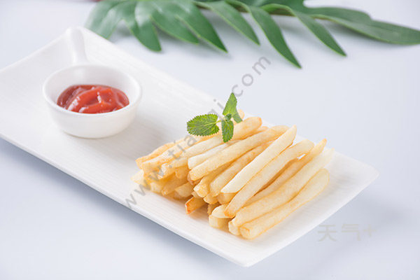 土豆去皮,切成条,浸泡一下,洗去淀粉,锅里加清水烧开,土豆条放进去煮至七成熟,捞出,土豆条晾干,放冰箱中冷冻,冻至土豆条冻发硬后,取出,锅中倒油,油温烧至7成热,下土豆条炸至金黄色,捞出,撒少许盐,蘸点番茄酱,即可食用。