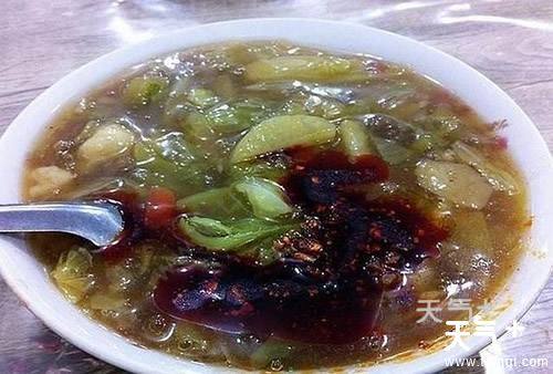 用面粉、香菜、菠菜、粉条、海带丝,葱、姜末少许。精盐、胡椒粉,酱油、醋配料以一定的比例烧沸而成,粘稠如粥,酸辣可口。