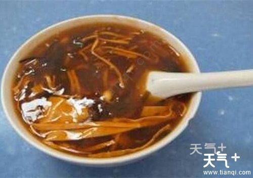 南阳胡辣汤也是以羊肉汤提鲜味,以胡椒粉提辣味。只不过在原料选择上更为简约明快:熟羊肉(或牛肉)和面筋照例是要的,粉条改用粉皮,千张豆腐都弃之不用,而以黄花菜代之。浓淡适口,胡辣鲜香。