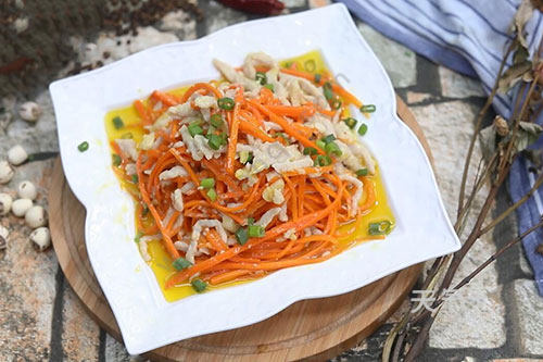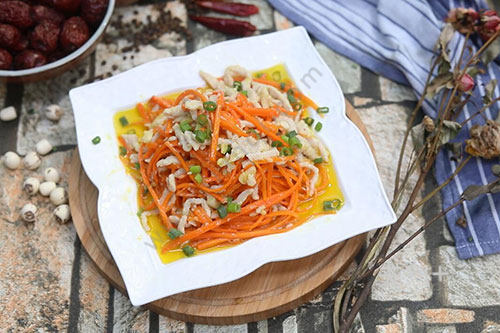 胡萝卜洗净切丝,里脊肉洗净切丝,放盐、料酒、鸡蛋清、淀粉腌制10分钟,油温烧至七成热,放肉丝翻炒至变色,盛出待用,留底油,放姜蒜末爆香,放胡萝卜翻炒至断生,加肉丝炒匀,调盐、鸡精,盛出后撒上葱花即可。