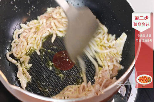 2.锅内放入适量油,油温烧至七成热,放入肉丝翻炒至变色,盛出待用;
