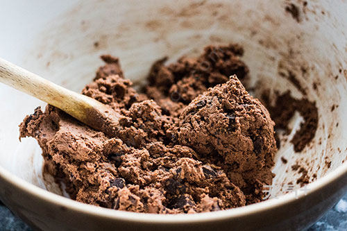 4.将巧克力牛奶液慢慢倒入蛋黄糊中,边倒边搅拌;