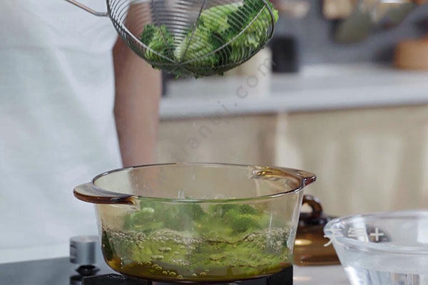 2.然后在锅中放入适量清水,将西兰花放入锅中,滴2滴油,焯水1分钟,捞出放入凉水中冷却后沥干。
