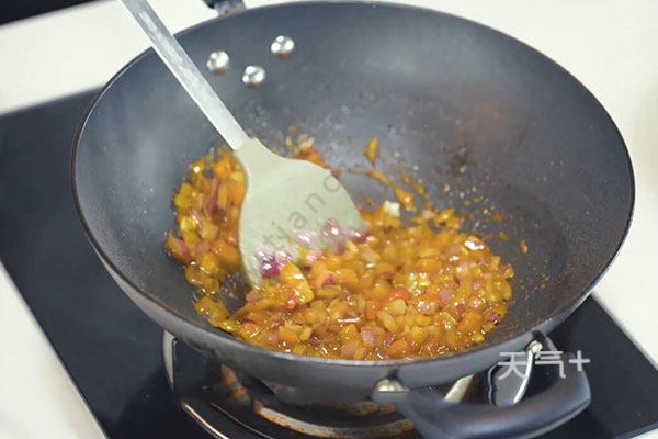 2.接着再往锅内放入适量油,油温烧至6成热,放入洋葱炒软,加入西红柿翻炒均匀。